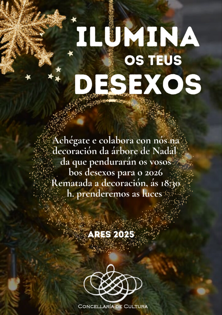 O venres, 5 de decembro, a partir das 17:00 h., o Concello convida ós e ás aresáns a colaborar na decoración da árbore de Nadal na Ponte da Ciscada, o acto simbólico que dá inicio ao período festivo en Ares. Baixo o nome ‘Ilumina os teus desexos’, a veciñanza poderá pendurar da árbore os bos […]