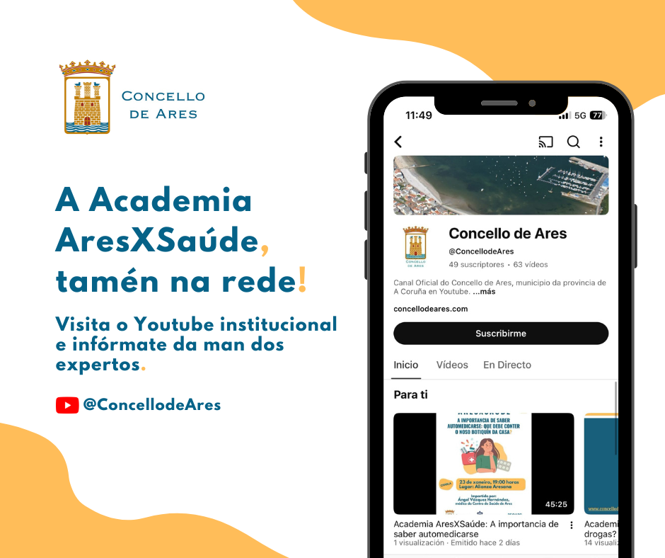 Na canle de Youtube municipal atoparás contidos relacionados coa automedicación, a xestión emocional ou a diabetes a un só click de distancia. E tamén poderás ver en directo cada charla da Academia AresXSaúde que se promova por parte das áreas de Deportes e Benestar.