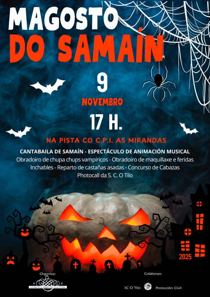 A pista cuberta do CPI As Mirandas acollerá un abano de actividades destinadas ós pequenos e pequenas e ás súas familias, facendo da data un bo momento de lecer. Haberá castañas asadas, un photocall para inmortalizar os disfraces grazas á colaboración da S.C. O Tilo e incluso un concurso de cabazas para sacar toda a creatividade a relucir.