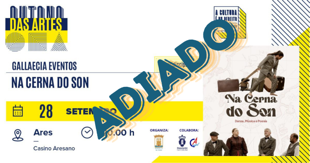 Informamos que, por razóns familiares do grupo actoral de Gallaecia Eventos, a representación do espectáculo “Na Cerna do Son”, prevista para o vindeiro domingo 28 de setembro ás 20:00 horas no Casino Aresano, queda adiada. O evento, promovido pola Concellaría de Cultura, en colaboración coa Deputación da Coruña e o propio Casino Aresano, será reprogramado […]
