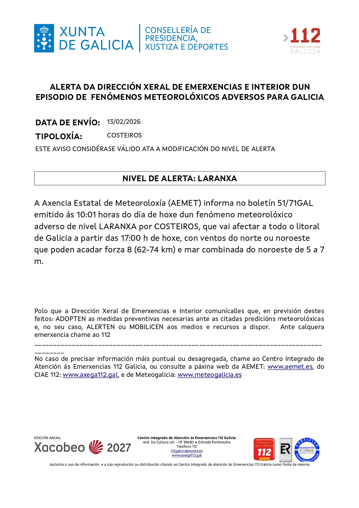 Continúan los fenómenos meteorológicos adversos de estos últimos días, tal y como se informa en el último boletín de la Agencia Estatal de Meteorología (AEMET), con un episodio de nivel NARANJA 🟠 (Riesgo importante) por COSTEROS que afectará a todo el litoral de Galicia desde las 17:00 h. de hoy, 📅 13 de febrero.