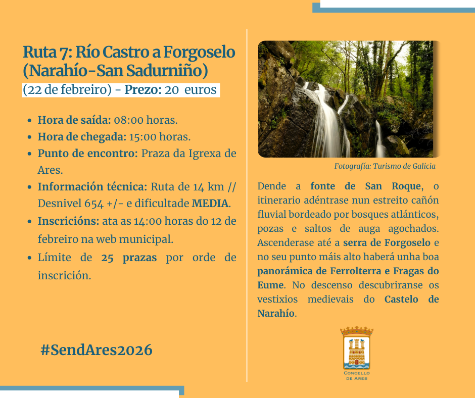 El itinerario será de aproximadamente 14 kilómetros, con dificultad media, y se celebrará el domingo 22 de febrero. El precio es de 20 euros e incluye servicio de guía, seguros y desplazamiento de ida y vuelta. Desde la Praza da Igrexa de Ares, punto de encuentro, la salida será a las 8:00 h. y el regreso al casco urbano está previsto alrededor de las 15:00 horas.