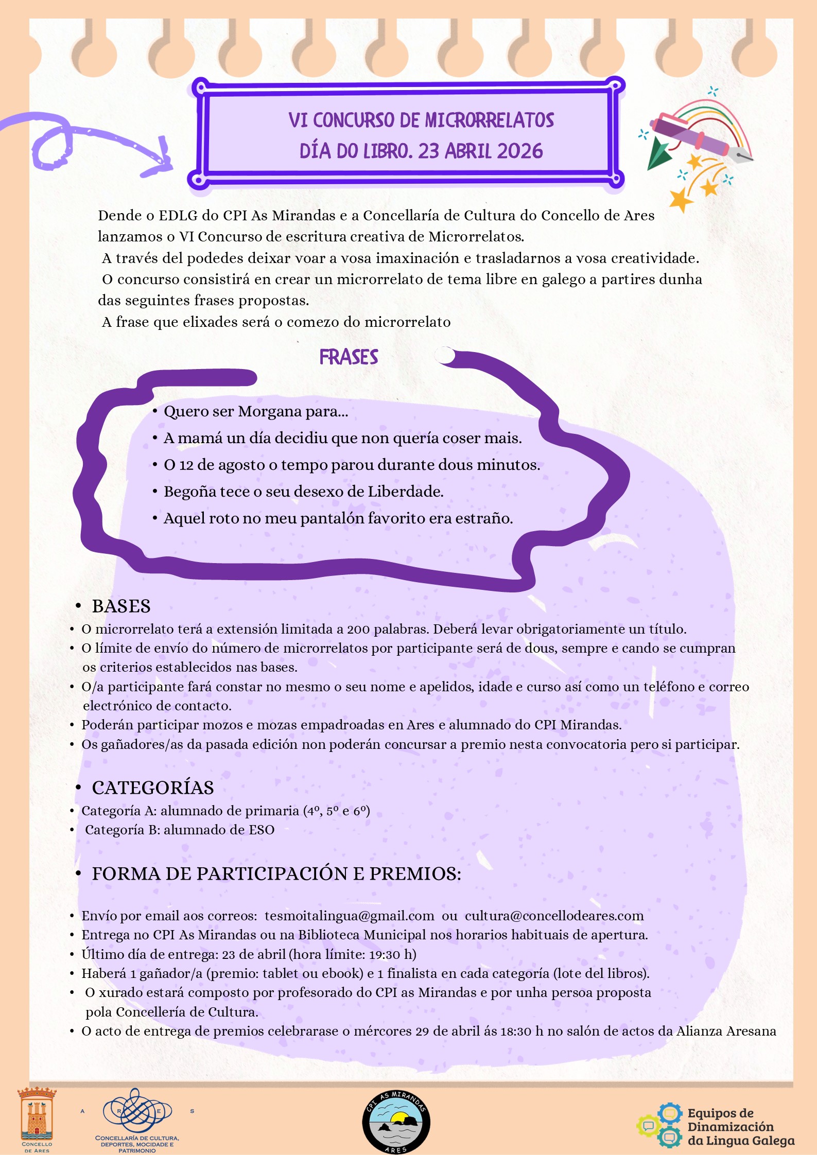 La Concejalía de Cultura y el colegio municipal de Ares convocan un año más el VI Concurso de Microrrelatos Escolares, un certamen que tiene como objetivo fomentar la creatividad literaria y la escritura entre la juventud de la villa, y conmemorar también el Día del Libro 2026.