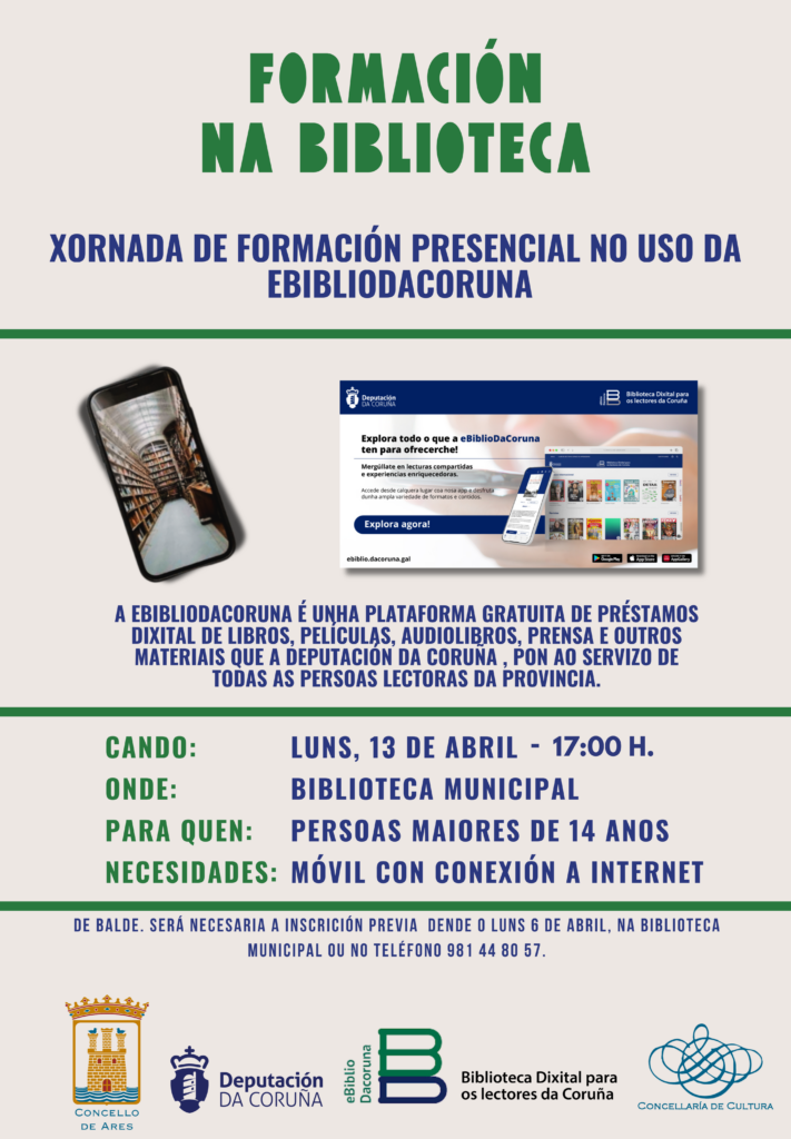 Si quieres saber cómo funciona la plataforma de préstamos digitales de libros, películas, prensa, audiolibros y otros materiales de la Diputación de A Coruña, acércate el próximo lunes 13 de abril a la Biblioteca Municipal de Ares a las 17:00 h.