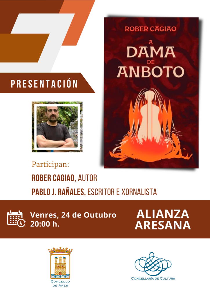 Este viernes, 24 de octubre, a partir de las 20:00 horas, el escritor nacido en Bañobre (Miño) Rober Cagiao estará en el salón de actos de la Alianza Aresana para presentar, junto al periodista y escritor Pablo J. Rañales, su última novela: La Dama de Anboto, publicada recientemente tanto en gallego (Calacán Editora) como en castellano (VR Ediciones).