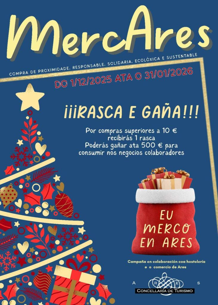 Siguen en juego los premios de 5, 10, 20 o 100 euros en los vales-rasca del MercAres. Solo tienes que realizar una compra superior a 10 euros en alguno de los más de 90 establecimientos adheridos para recibir tu rasca y, si resultas premiado/a, podrás invertir el importe en los propios comercios participantes.
