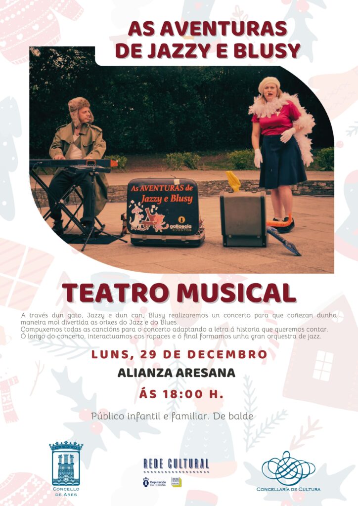 A partir de las 18:00 h, en la Alianza Aresana, el equipo de Gallaecia Eventos profundizará en los orígenes del jazz y del blues de la mano del gato Jazzy y el perro Blusy, adaptando la letra de las canciones del concierto para construir una historia. Además, interactuarán con los niños y niñas y, al final del espectáculo teatral, formarán una gran orquesta de jazz.