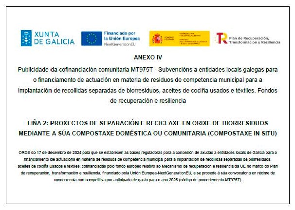 O concello de Ares executa un proxecto financiado por parte da Vicepresidencia Segunda e Consellería de Medio Ambiente e Cambio Climático por importe de 13.464,00 € ao abeiro da ORDE do 17 de decembro de 2024 pola que se establecen as bases reguladoras para a concesión de axudas a entidades locais de Galicia para o financiamento de actuacións en materia de residuos de competencia municipal para a implantación de recollidas separadas de biorresiduos, aceites de cociña usados e téxtiles, cofinanciadas polo fondo europeo relativo ao Mecanismo de recuperación e resiliencia da UE no marco do Plan de recuperación, transformación e resiliencia, financiado pola Unión Europea-NextGenerationEU, e se procede á súa convocatoria en réxime de concorrencia non competitiva por anticipado de gasto para o ano 2025 (código de procedemento MT975T), continuar coa implantación dun sistema de composteiros individuais debido a que moitos dos nosos asentamentos son en vivendas individuais illadas.