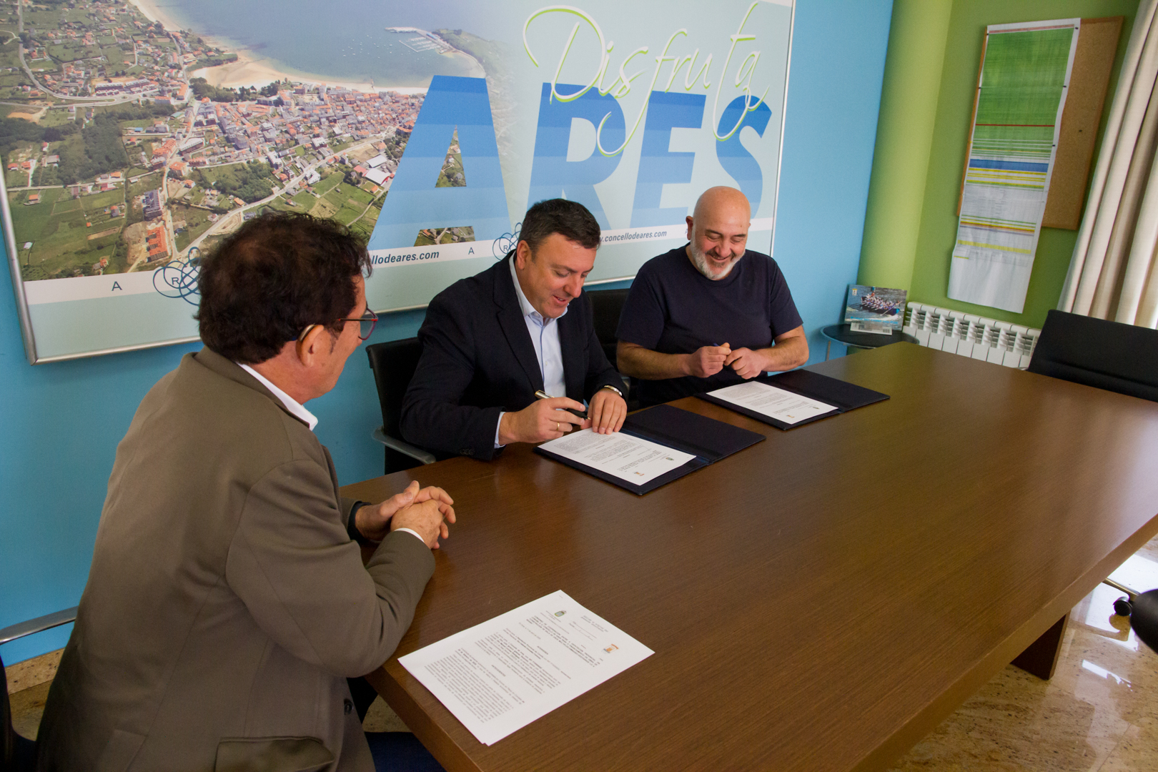 - Xunto coa visita institucional, Deputación e Concello asinaron un convenio para impulsar as futuras obras na contorna do Club de Tenis de Redes, coa construcción de nova planta dun ximnasio, uns vestiarios e unha sala de usos múltiples para desfrute tanto dos seus socios como da veciñanza de Ares, con especial énfase na da parroquia de Caamouco.