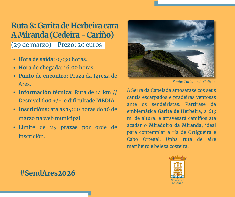 Será unha ruta de 14 quilómetros de vento mareiro e beleza costeira, cunha dificultade media, e que se realizará durante o domingo, 29 de marzo. O prezo é de 20 euros e inclúe servizo de guía, seguros e desprazamento de ida e volta. Dende a Praza da Igrexa de Ares, o punto de encontro, sairase ás 7:30 h. e regresarase ao núcleo urbano preto das 16:00 horas.